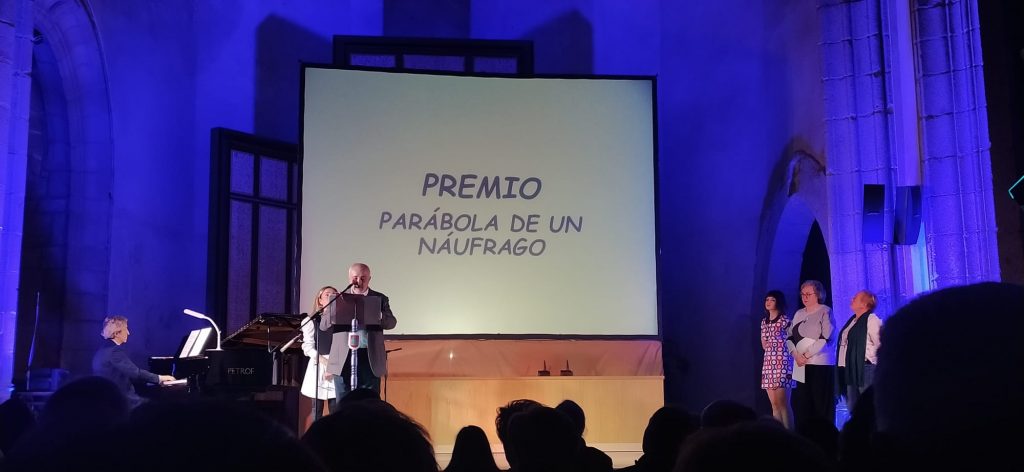 El sexto premio, «Parábola de un náufrago», fue un homenaje a nuestro compañero, fallecido en el mes de febrero, y excelente poeta, Juan Pedro Fernández Blanco. Varios compañeros leyeron algunos de sus poemas, antes de que la periodista Ana Agustín entregase la estatuilla a la familia. Quisieron decir unas palabras de agradecimiento su madre, María Victoria, y su cuñado, Carlos. Fue un acto muy sentido, que emocionó a los asistentes.